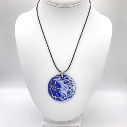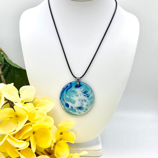 This is a beautiful necklace and looks even better in person! The pendant design is reminiscent of marble and the color and quality is crystal clear!