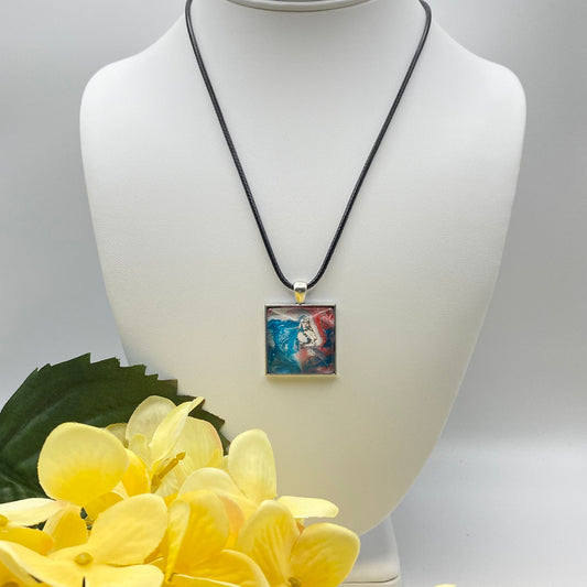 Hand Painted Glass Cabochon Square Bezel Pendant Necklace